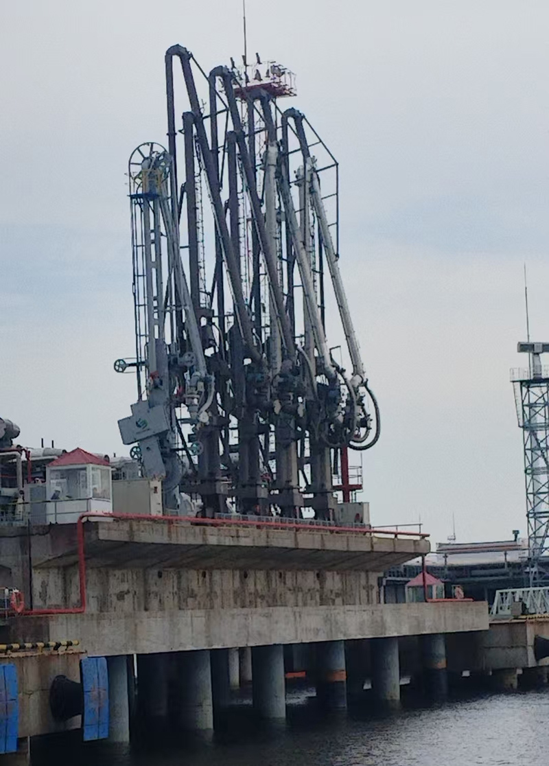 碼頭輸油臂(又稱船用流體裝卸臂)是港口用于液態(tài)石油化工產(chǎn)品裝卸船作業(yè)的核心設(shè)備,通過旋轉(zhuǎn)接頭與支撐結(jié)構(gòu)跨接碼頭與船舶,實現(xiàn)原油、成品油、液化氣等介質(zhì)的高效、安全傳輸。其設(shè)計需適應(yīng)潮汐變化、船體升降及風(fēng)浪引起的位移,是現(xiàn)代化碼頭的關(guān)鍵基礎(chǔ)設(shè)施。