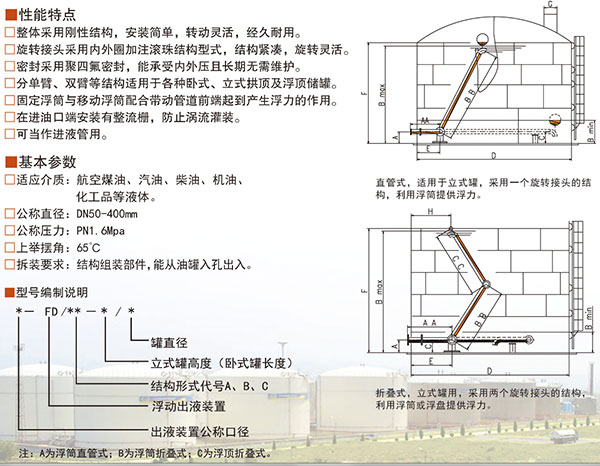 ?。?)旋轉(zhuǎn)接頭,主要有、內(nèi)圈、外圈、主密封、連接法蘭、鋼球組成。每臺裝置包含3只旋轉(zhuǎn)接頭,用于將裝置各部件進(jìn)行連接,并隨罐內(nèi)油面上下浮動(dòng)、轉(zhuǎn)動(dòng)。主密封采用具有自動(dòng)補(bǔ)償性的增強(qiáng)聚四氟材料,具有靈活,密封良好等特點(diǎn)。
