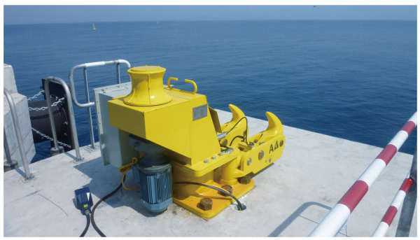 本實(shí)用新型涉及一種脫纜鉤測(cè)力裝置,包括不銹鋼外殼、螺紋油槽、測(cè)力感應(yīng)集成芯片和數(shù)據(jù)線,在不銹鋼外殼外側(cè)設(shè)置多個(gè)螺紋油槽,在不銹鋼外殼內(nèi)壁附著多個(gè)塊狀的測(cè)力感應(yīng)集成芯片,在測(cè)力感應(yīng)集成芯片外端連接數(shù)據(jù)線.本實(shí)用新型的有益效果是:可以為自動(dòng)脫纜鉤提供脫纜數(shù)據(jù),并及時(shí)反饋到總控制中心,控制中心計(jì)算機(jī)會(huì)直接向脫纜鉤的自動(dòng)脫纜系統(tǒng)下達(dá)命令,直接脫纜,使船舶和碼頭脫纜,不會(huì)因承載能力過(guò)大而損壞碼頭、脫纜設(shè)備、或船舶上的系纜設(shè)備等,避免不必要的損失。