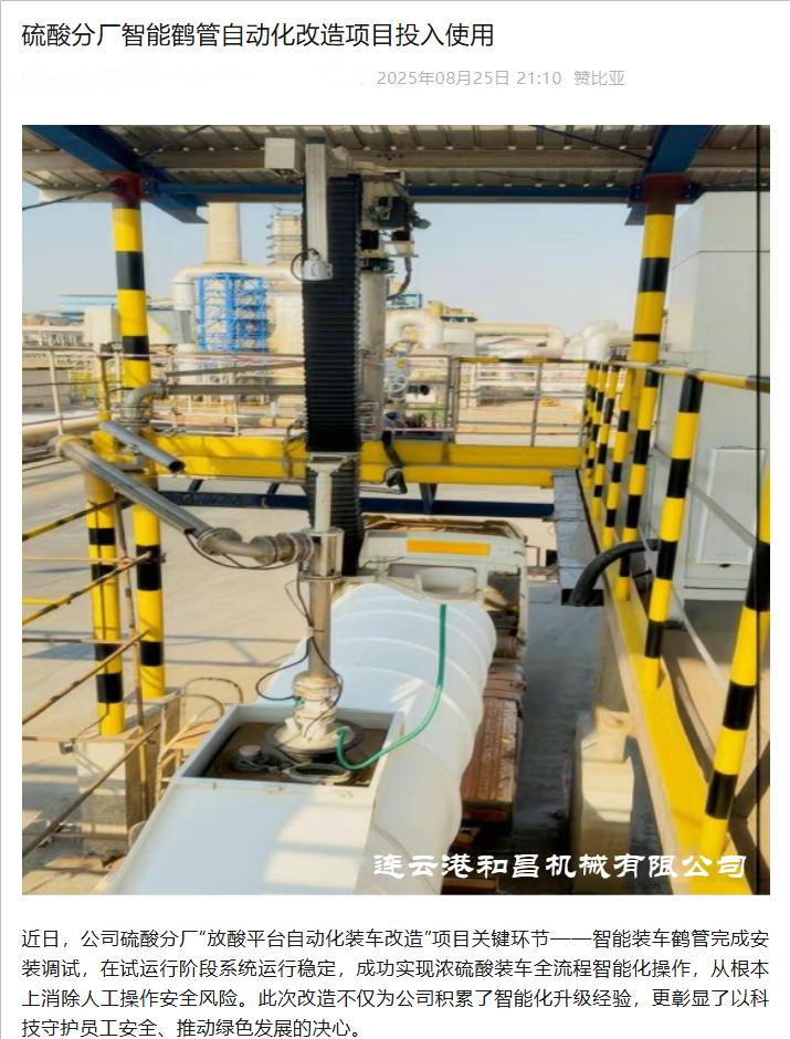 近日,由連云港和昌機械有限公司設(shè)計制造的智能裝車鶴管,在贊比亞某大型冶煉企業(yè)硫酸分廠完成安裝調(diào)試并投入試運行。該系統(tǒng)實現(xiàn)了濃硫酸裝車全流程的自動化、智能化操作,徹底取代傳統(tǒng)人工作業(yè)模式,顯著提升安全水平與作業(yè)效率,成為中國智造在國際工業(yè)場景中的又一次成功實踐。